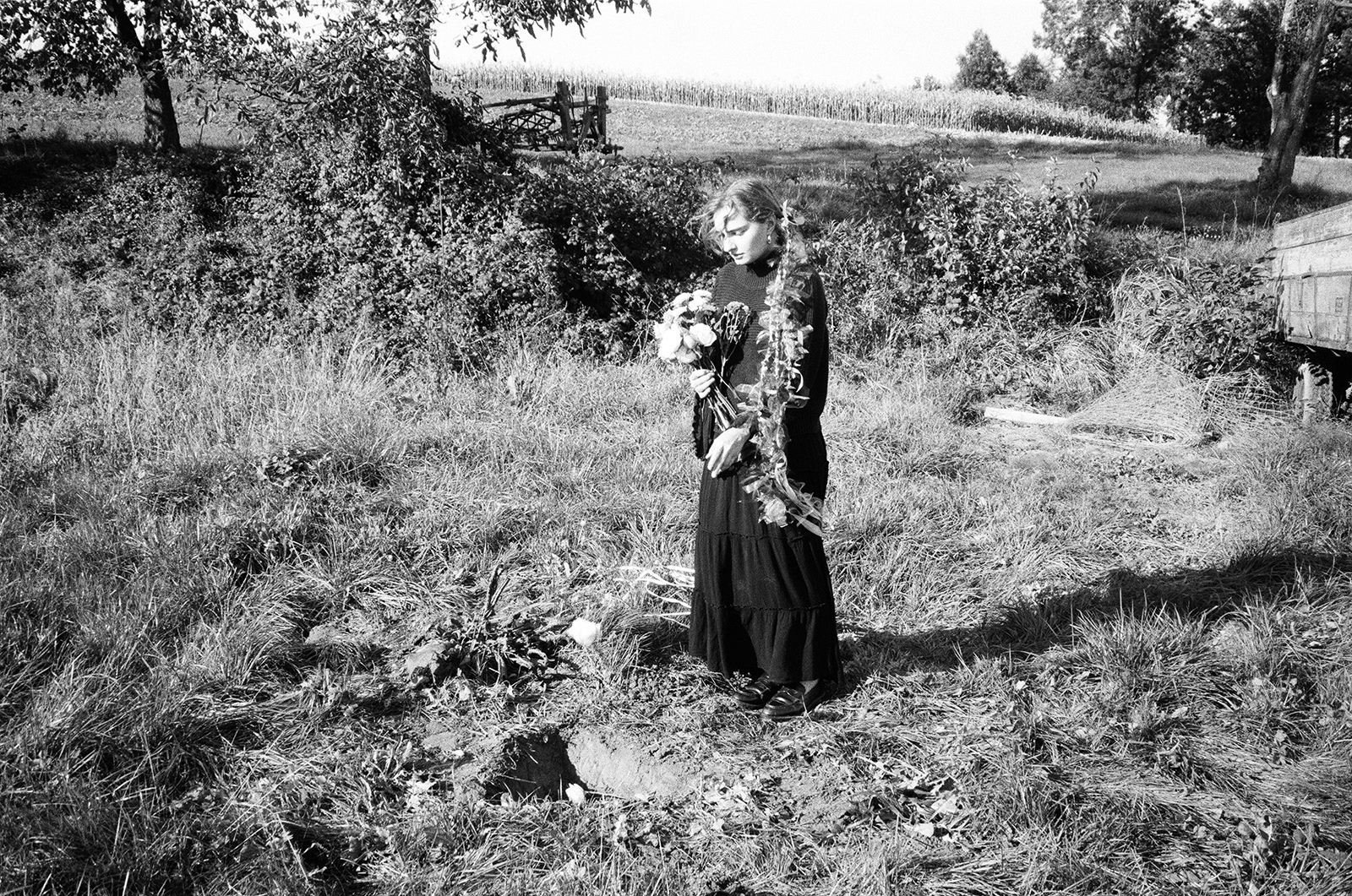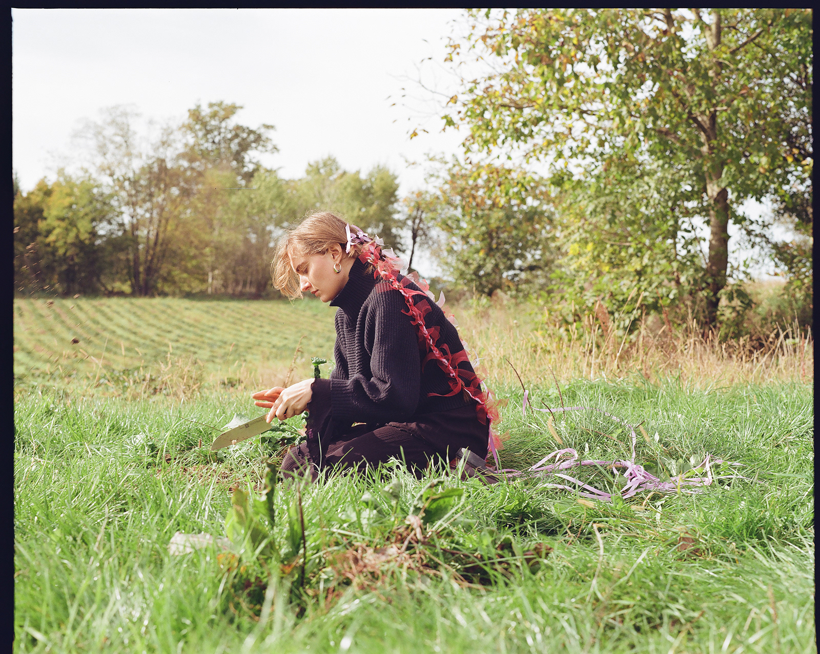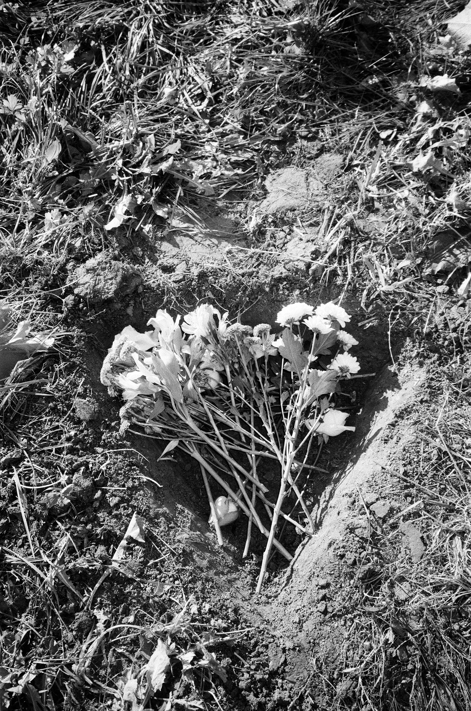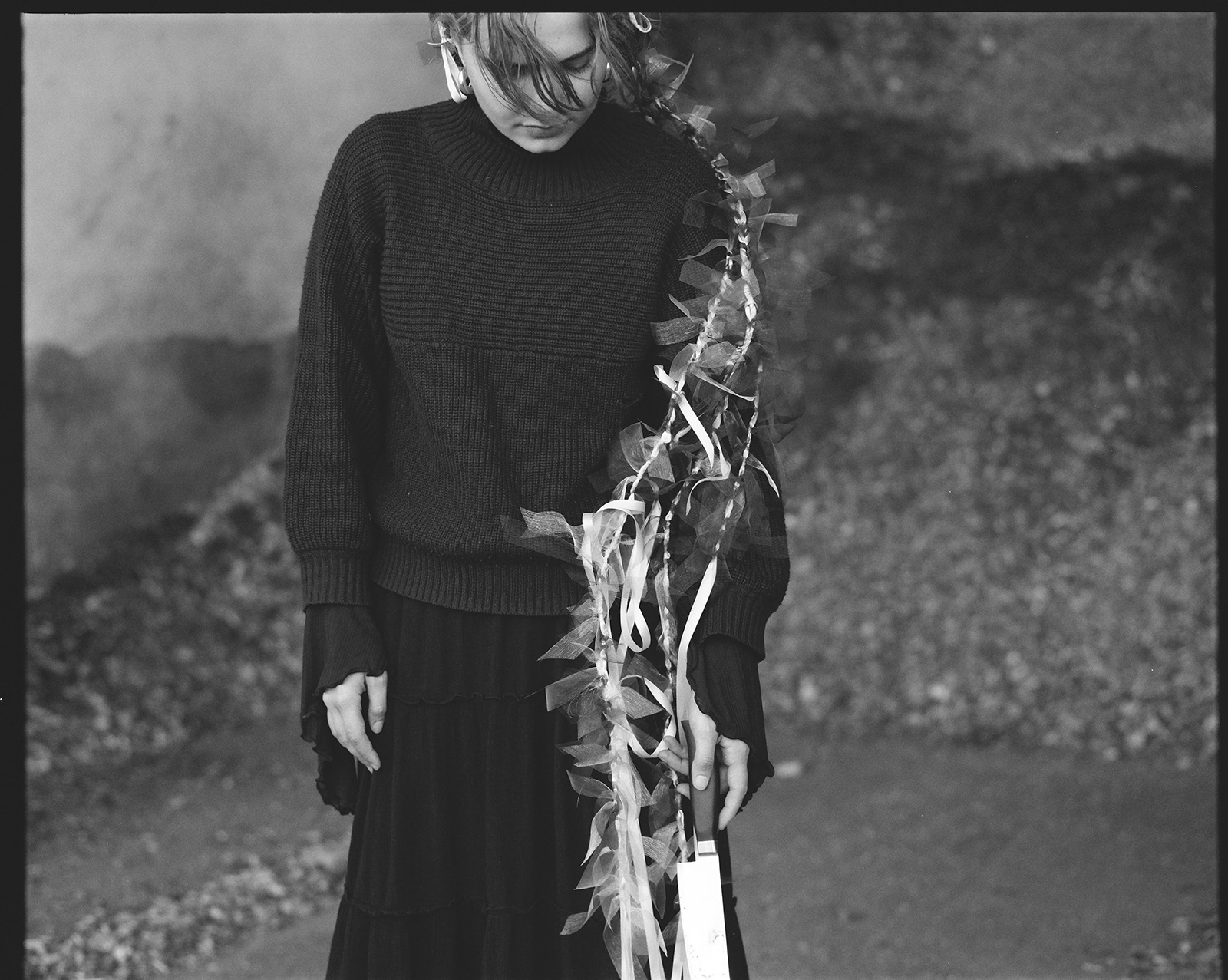 Each braid for a year, each bow for a femicide* or attempted murder. Each flower for a woman whose voice was taken from her long ago and which she has now lost completely. The knife, the most frequently used weapon in the attack. The triangular grave of the woman, as the shape of her own roof and a symbol of the pyramid of violence. Where does misogyny begin and where does it end as femicide?